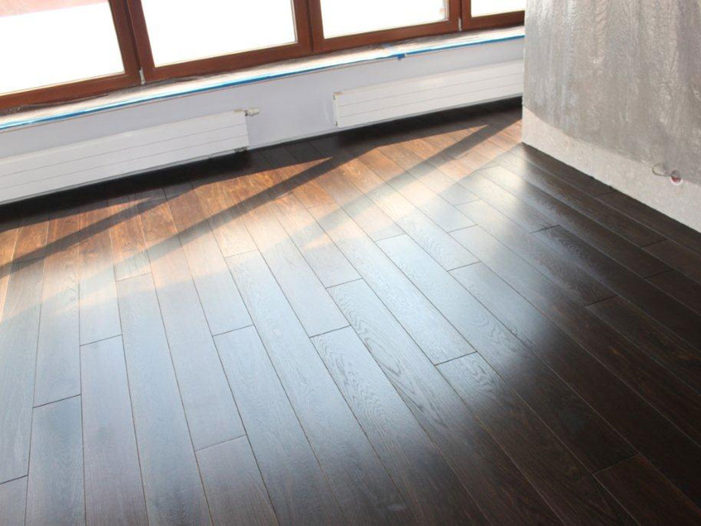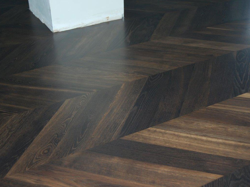 Parkiet z dębu wędzonego o wymiarze 22x100x500 mm przyklejony do podłoża, cyklinowane i lakierowane lakierem 2-składnikowym – pół mat