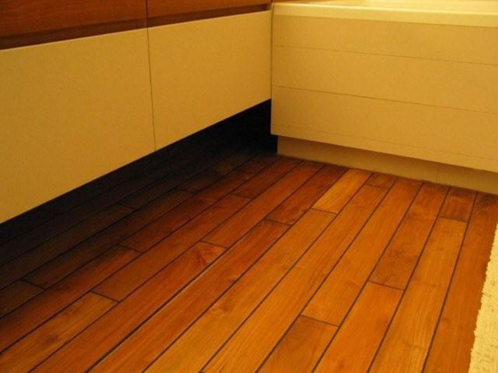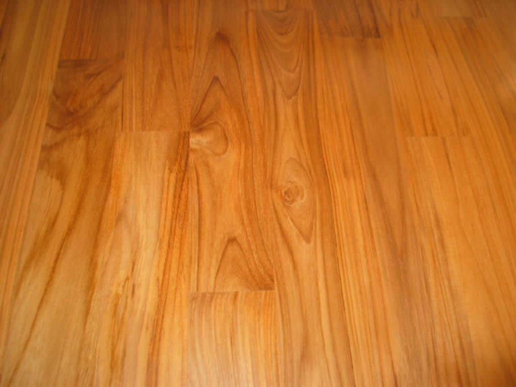 Deski z Teak'u Indonezyjskiego o wymiarze 15x90x500-1200 mm przyklejone do podłoża, cyklinowane i lakierowane lakierem 2-składnikowym – pół mat