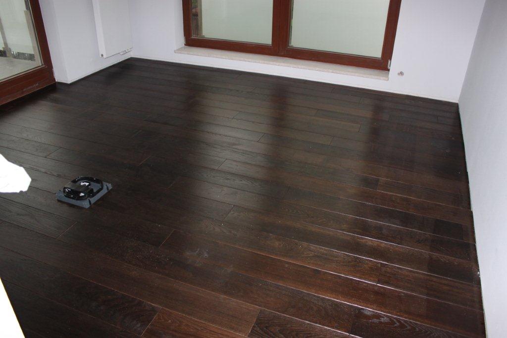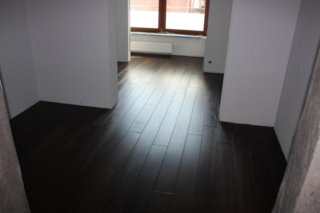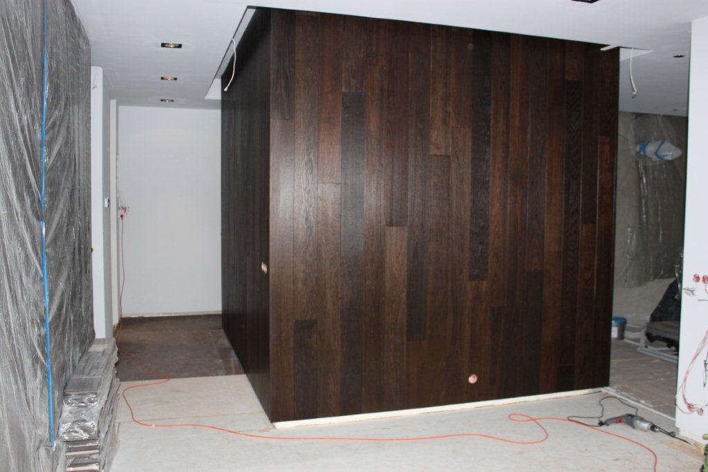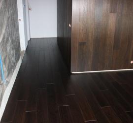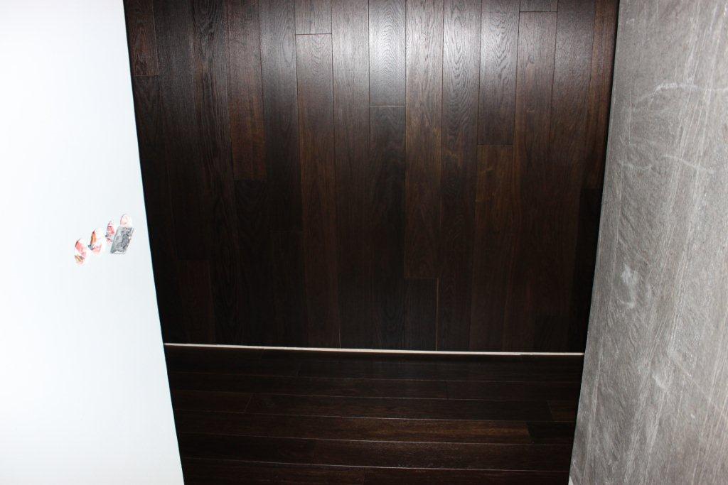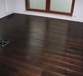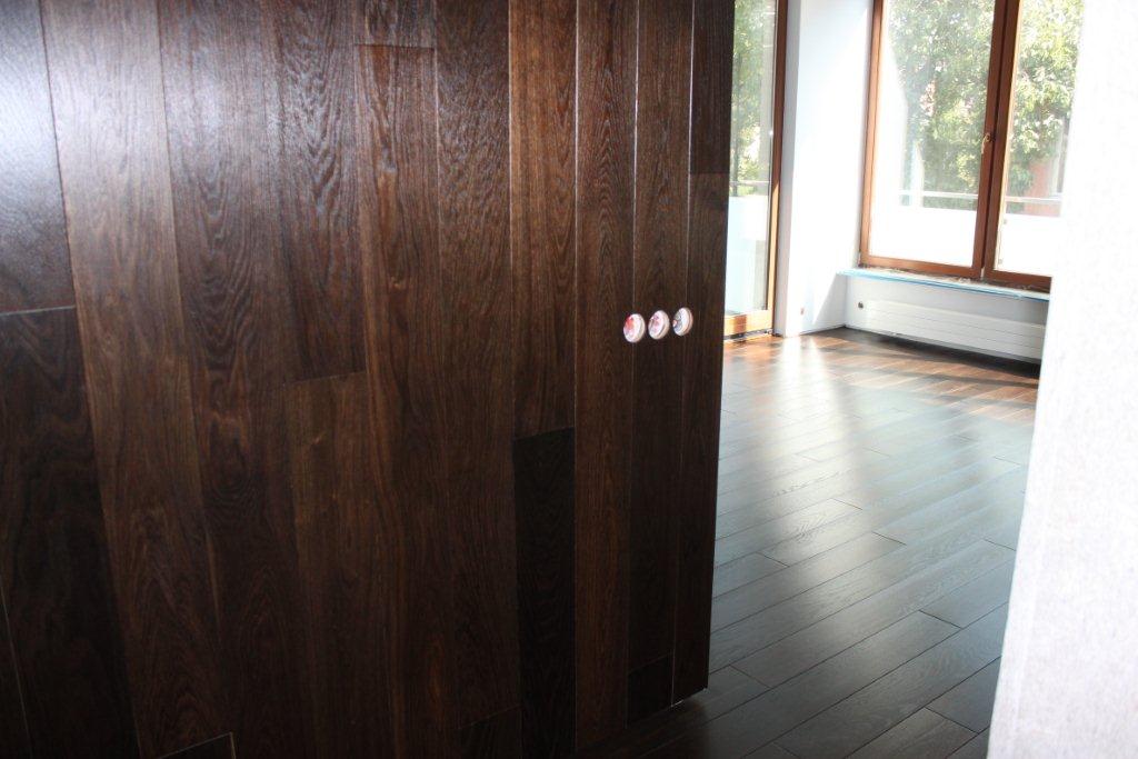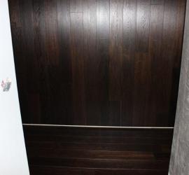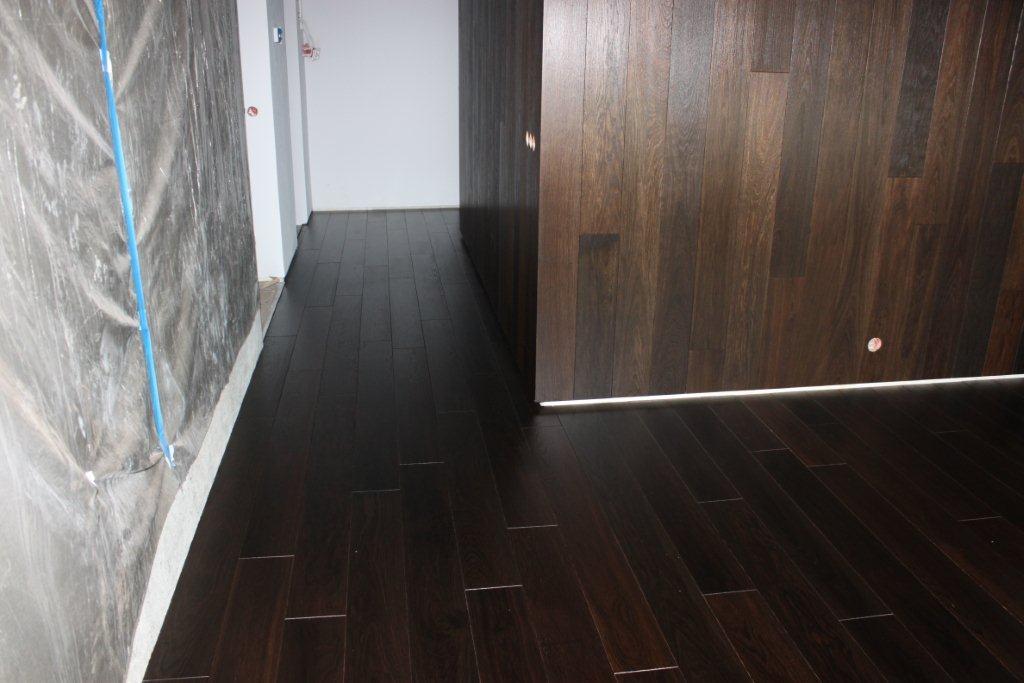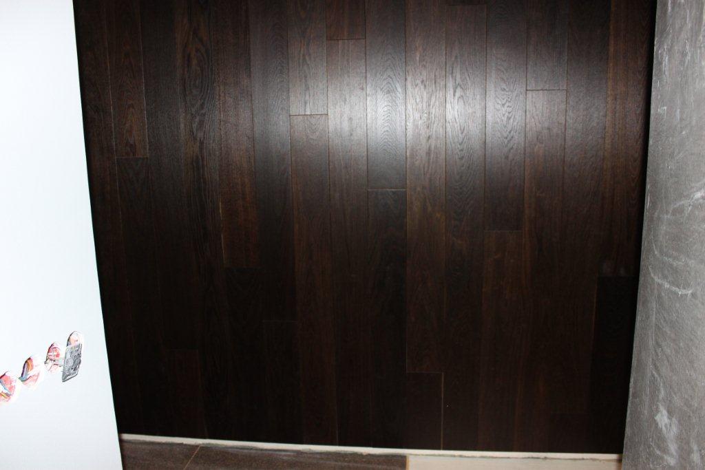 Deski podłogowe dąb wędzony z litego drewna o wymiarze 22x160x800-2200 mm olejowane fabrycznie – półmat, fazowane 4 stronnie, klejone do podłoża. Zabudowa ściany z deski podłogowej z dębu wędzonego klejona i przybijana do zamontowanej wcześniej na ścianie płyty OSB.