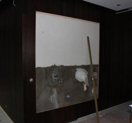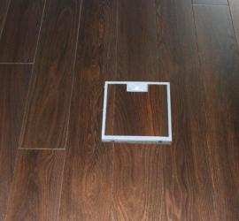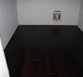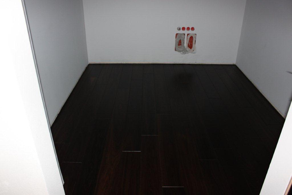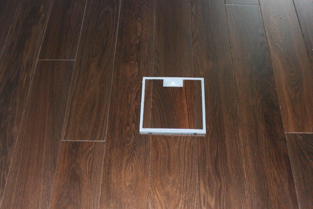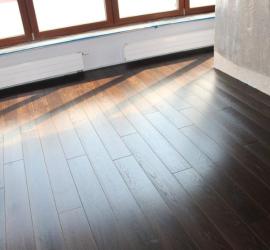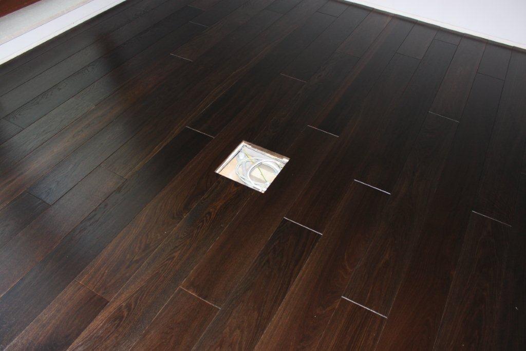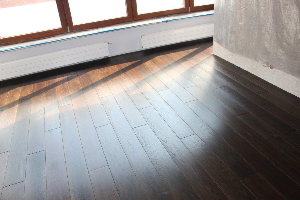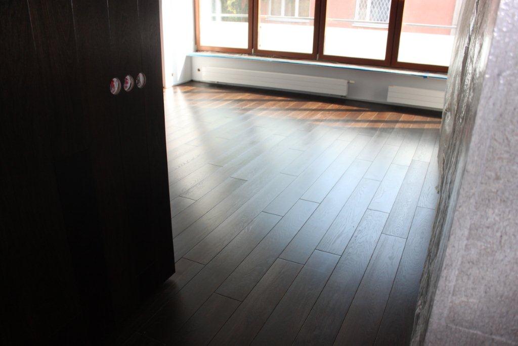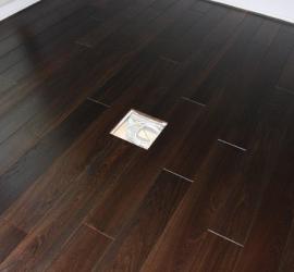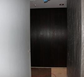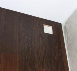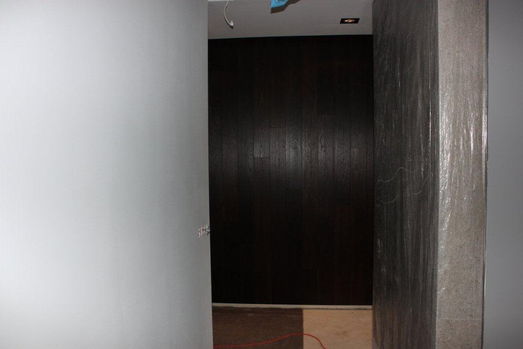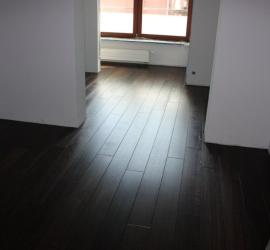 Deski podłogowe dąb wędzony z litego drewna o wymiarze 22x160x800-2200 mm olejowane fabrycznie – półmat, fazowane 4 stronnie, klejone do podłoża. Zabudowa ściany z deski podłogowej z dębu wędzonego klejona i przybijana do zamontowanej wcześniej na ścianie płyty OSB.
