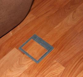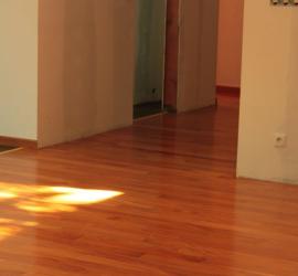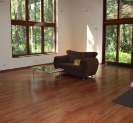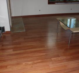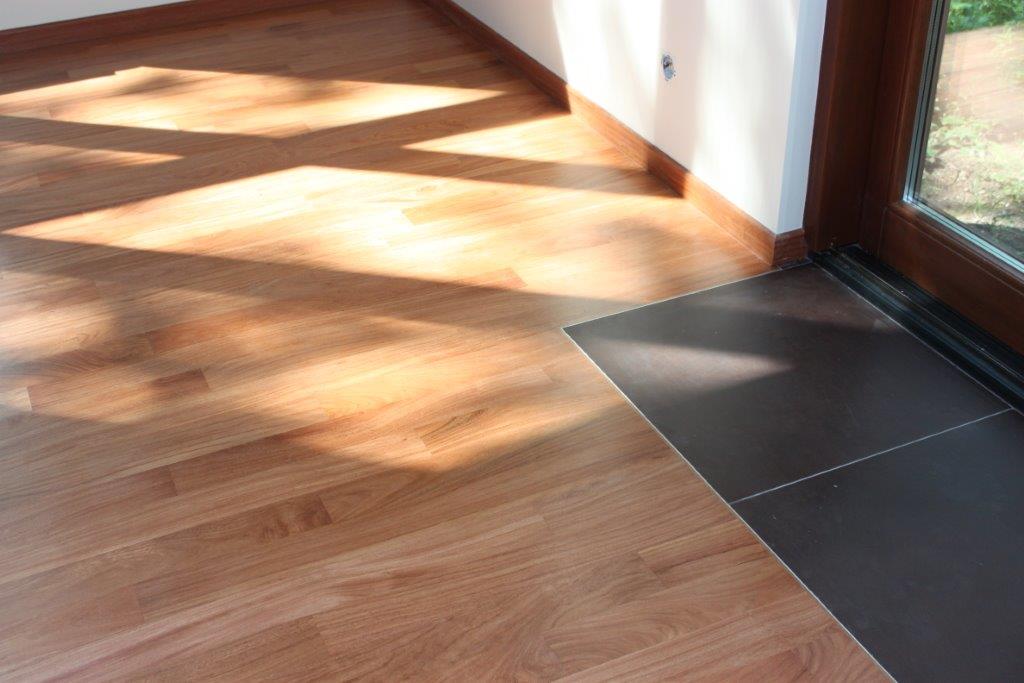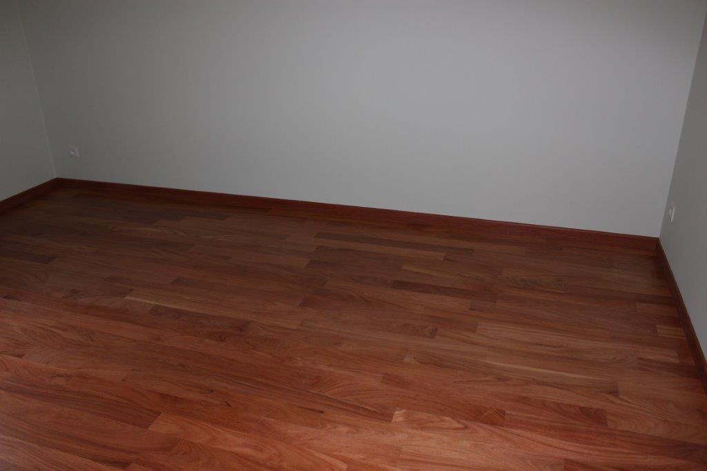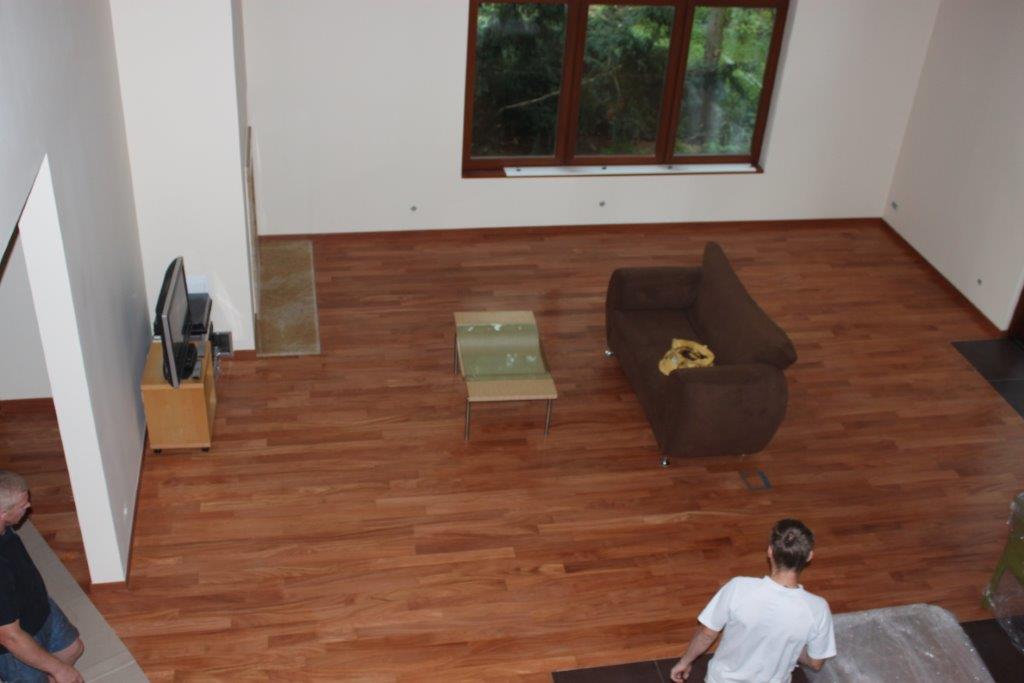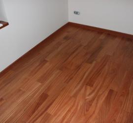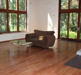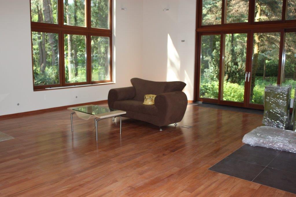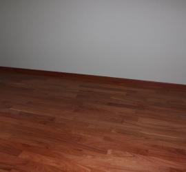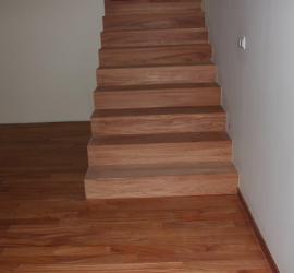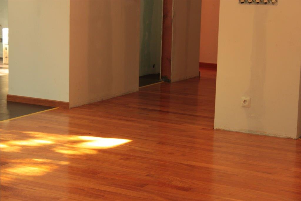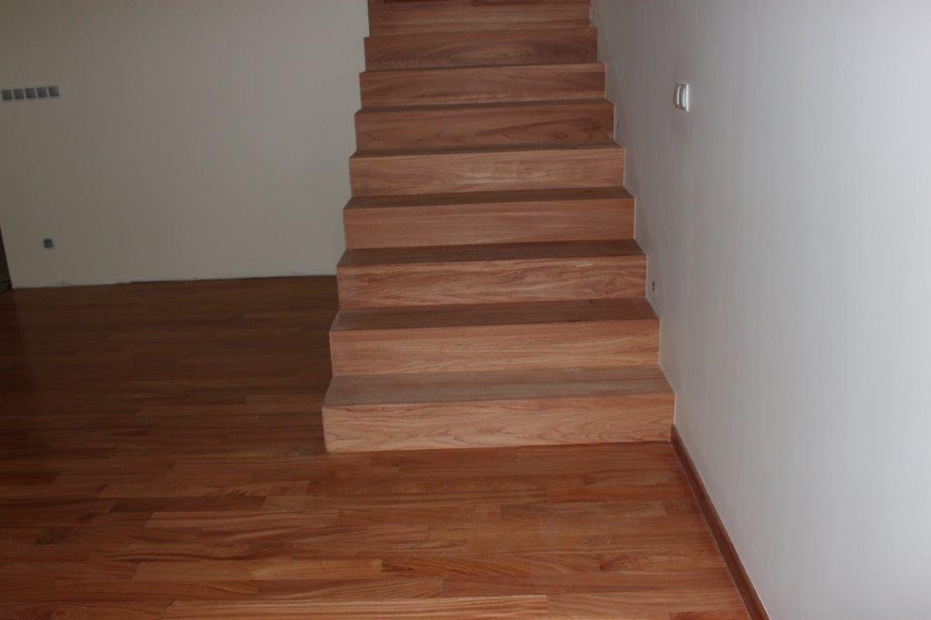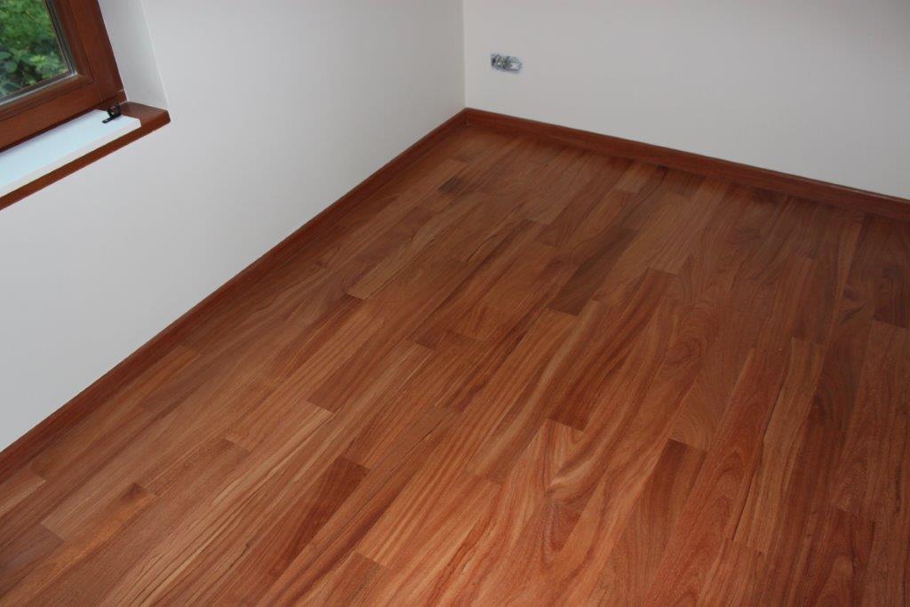 Deski z drewna egzotycznego o wymiarze 15x90x800-1200 mm przyklejone do podłoża i lakierowane lakierem 2-składnikowym – pół matowym.