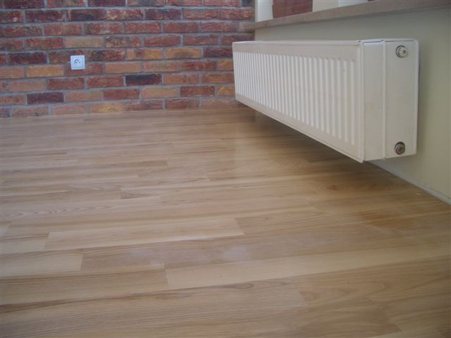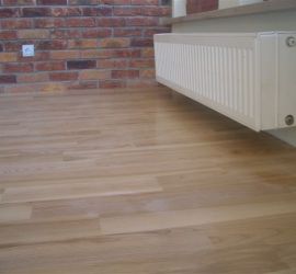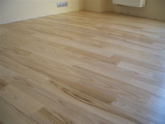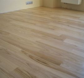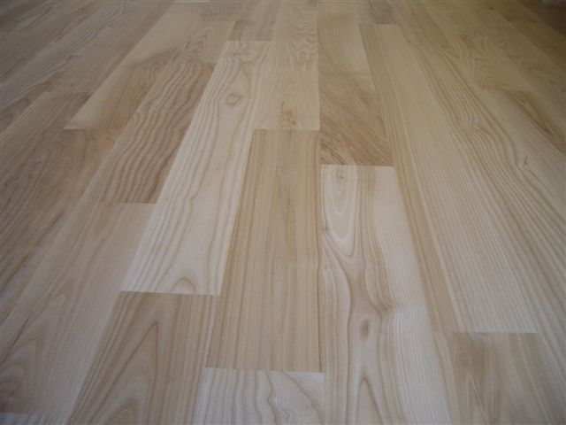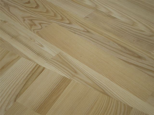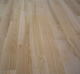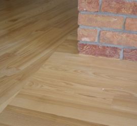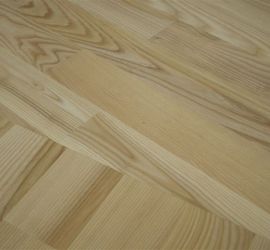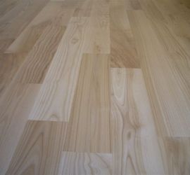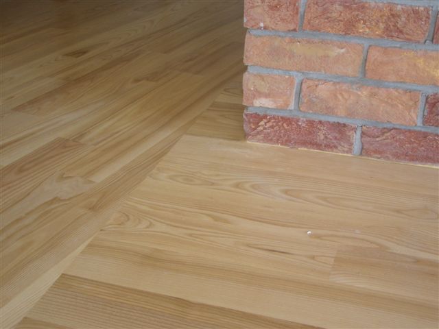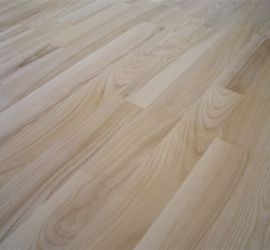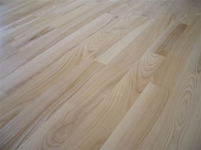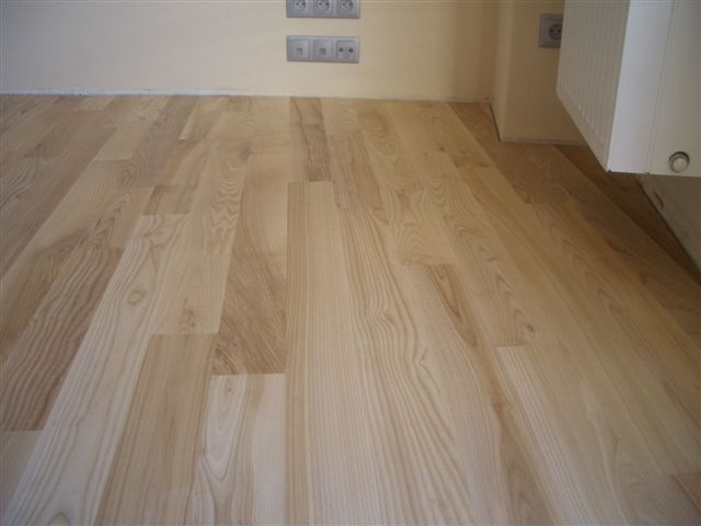 Deski podłogowe z Jesionu o wymiarze 22x100x600-1200 mm przyklejone do podłoża, cyklinowane i lakierowane lakierem 2-składnikowym – pół mat