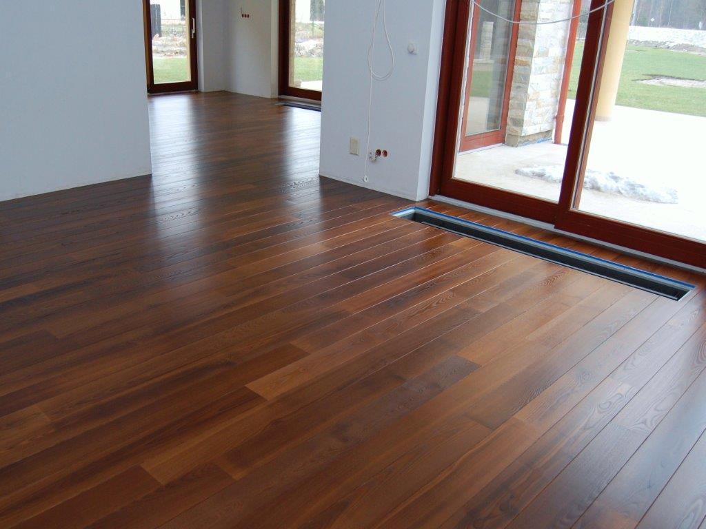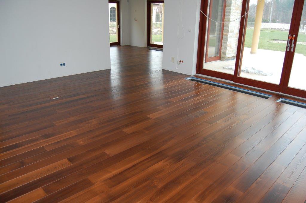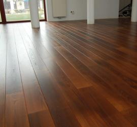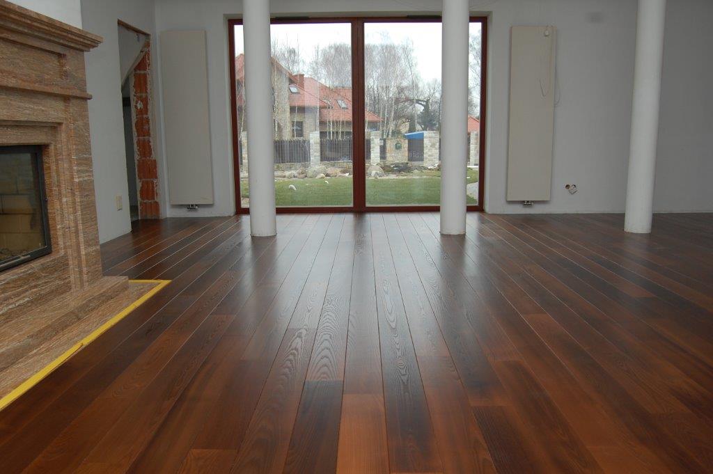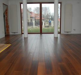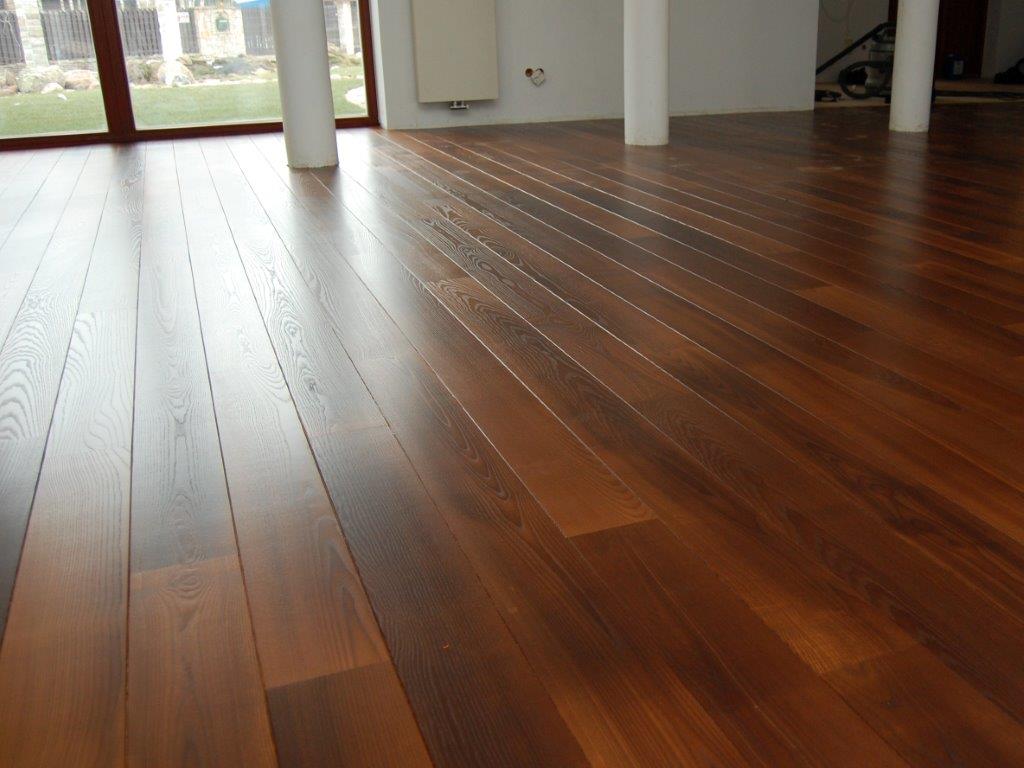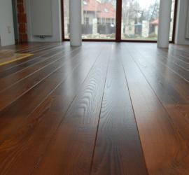 Deski podłogowe fazowane na długości o wymiarze 22x160x800-2200 mm przyklejone do podłoża, cyklinowane i lakierowane lakierem 2-składnikowym – pół mat