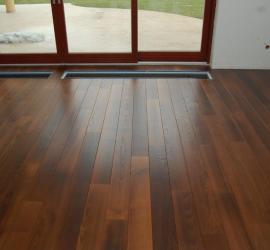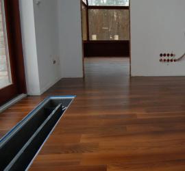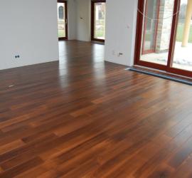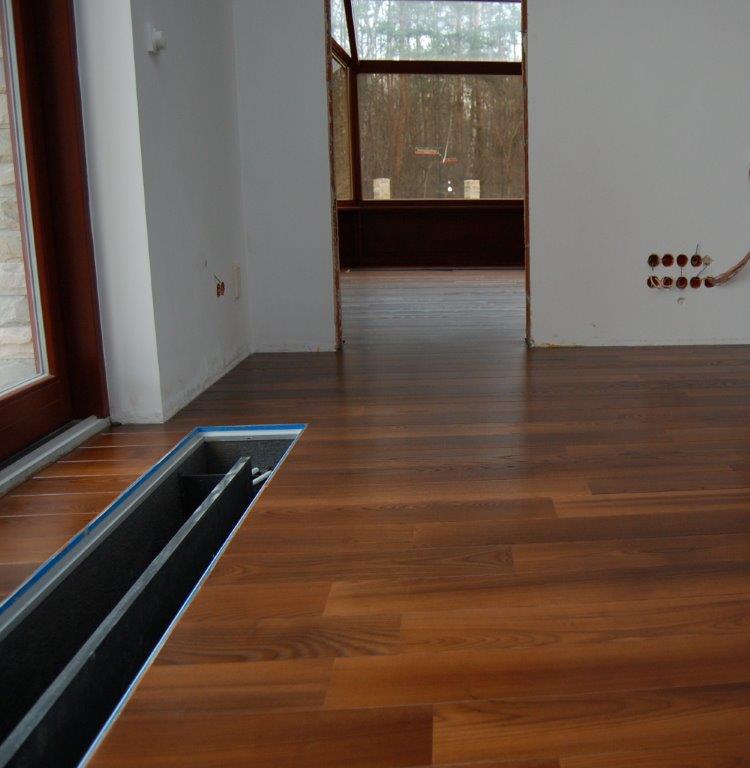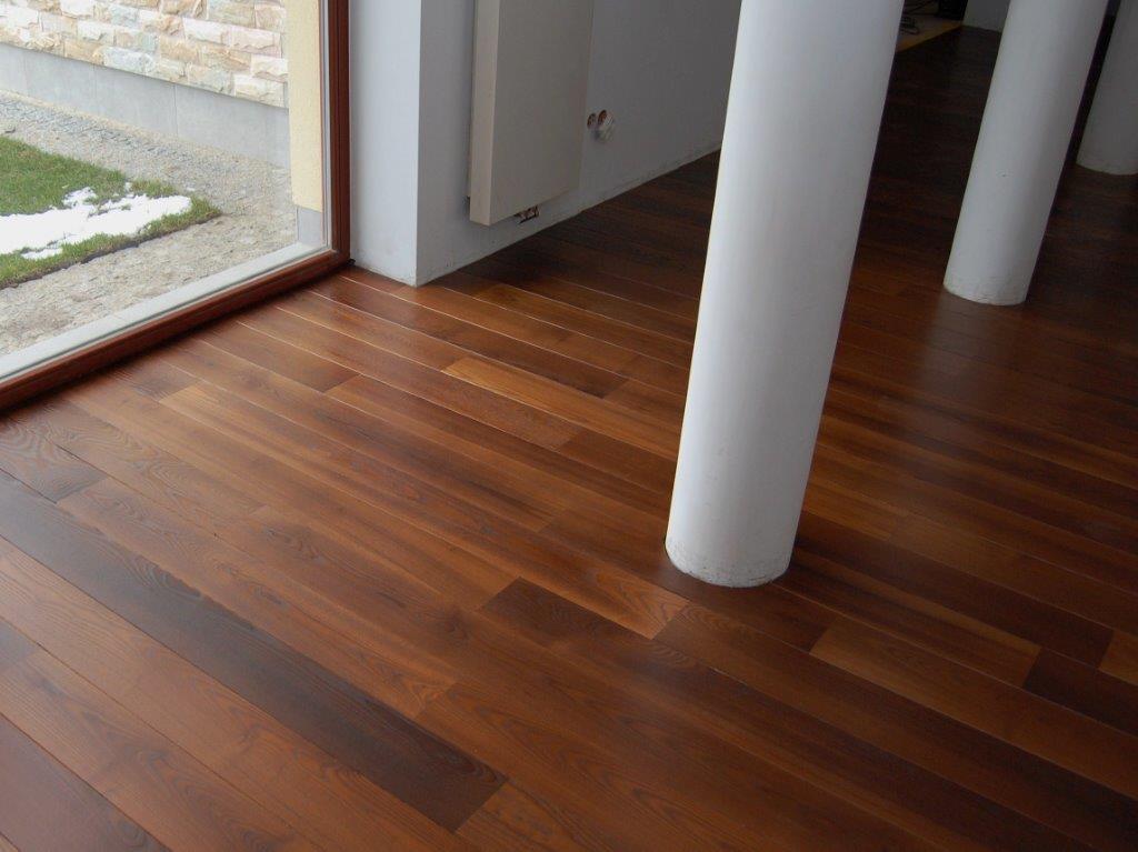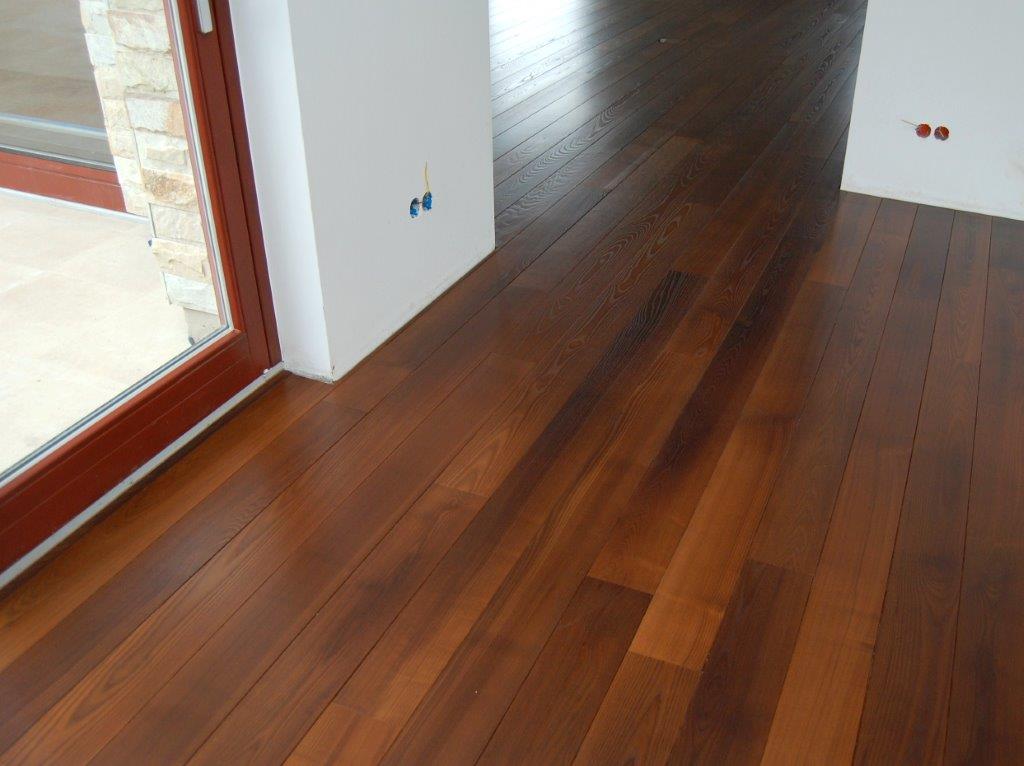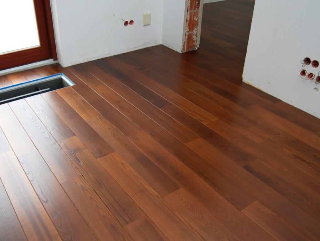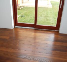 Deski podłogowe fazowane na długości o wymiarze 22x160x800-2200 mm przyklejone do podłoża, cyklinowane i lakierowane lakierem 2-składnikowym – pół mat